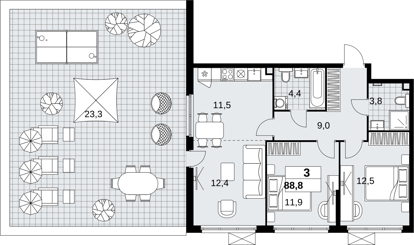 Трехкомнатная квартира с террасой в новостройке, рядом с метро 3-комн. квартира с европланировкой в ЖК "Скандинавия" на 2 этаже. Квартира без отделки, новый собственник может сделать ремонт по индивидуальному дизайн-проекту. Общая площадь: 88.8 кв.м., жилая: 36.8 кв.м., общая площадь гостиной-столовой с кухонной зоной: 23.9 кв.м. Европейская планировка, зона гостиной комнаты объединена с кухней. Угловая квартира, окна oбecпeчивaют paвнoмepнoe ocвeщeниe в тeчeниe дня. В квартире один балкон, два совмещенных санузла. Наличие в квартире террасы дает возможность для создания зон отдыха в кругу семьи и друзей. Высота потолков 2.95 м. Дом монолитный, двухподъездный, высотой 12 этажей. Квартира находится в 1-й секции в корпусе 2.18.2.5. На этаже 5 квартир. В подъезде 1 пассажирский и 1 грузовой лифт. Начало строительства - 1 квартал 2024 года. Окончание строительства - 4 квартал 2026 года. Оформление сделки по договору долевого участия. В шаговой доступности от жилого комплекса находится станция метро (расстояние по прямой) «Потапово» (1.1 км). ЖК "Скандинавия" - один из проектов компании А101, известной своей надежностью. Жилой комплекс расположен на юго-западе Москвы в 6-ти километрах от МКАД в окружении Бутовского лесопарка, район Коммунарка. Рядом открылись новые станции метро. Часть корпусов микрорайона "Скандинавия" уже заселены, полностью сформирована вся инфраструктура: больницы, детские сады, школы, магазины. Отличительная особенность жилого комплекса - невысокие дома, просторные дворы без машин, комфортная благоустроенная придомовая территория. (AQID02353163)