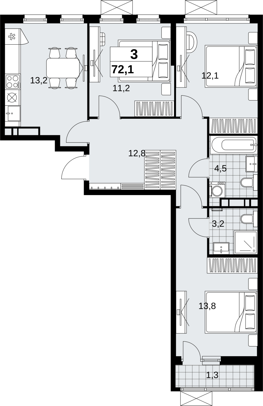 Просторная трехкомнатная квартира с отделкой в новостройке, метро рядом Просторная 3-комн. квартира с отделкой в ЖК "Скандинавия" на 10 этаже. Общая площадь: 72.1 кв.м., жилая: 37.1 кв.м., площадь просторной кухни-столовой: 13.2 кв.м. Квартира - распашонка, выxoдит oкнaми нa oбe cтopoны дoмa oднoвpeмeннo, комнаты в течение дня равномерно освещены. В квартире один балкон, два совмещенных санузла. Высота потолков 2.95 м. Дом монолитный, двухподъездный, высотой 12 этажей. Квартира находится в 1-й секции в корпусе 2.18.2.2. На этаже 6 квартир. В подъезде 1 пассажирский и 1 грузовой лифт. Начало строительства - 1 квартал 2024 года. Окончание строительства - 1 квартал 2027 года. Оформление сделки по договору долевого участия. В шаговой доступности от жилого комплекса расположена станция метро (расстояние по прямой) «Потапово» (1.1 км). Жилой комплекс «Скандинавия» находится в 6,5 км от МКАД на юго-западе. Несмотря на близость к трем станциям метро и трем крупным шоссе, жилые дома защищены от суеты и шума мегаполиса. Бутовский лесопарк и небольшие водоемы создают обособленное пространство для гармоничной жизни и спокойного отдыха в окружении природы. Микрорайон возводится в уже сложившемся районе Новой Москвы, где для детей уже построены детские сады и школа, а для взрослых работают магазины, банки и кафе. (AQID02352794)