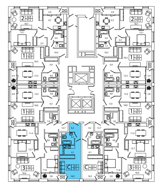 - Двух 25-этажных односекционных на 242 квартиры каждое;