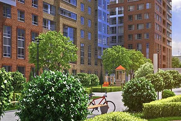 - Закрытый зеленый двор с пешеходными дорожками, спортивными и детскими площадками;