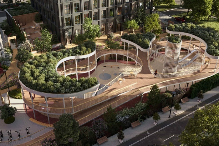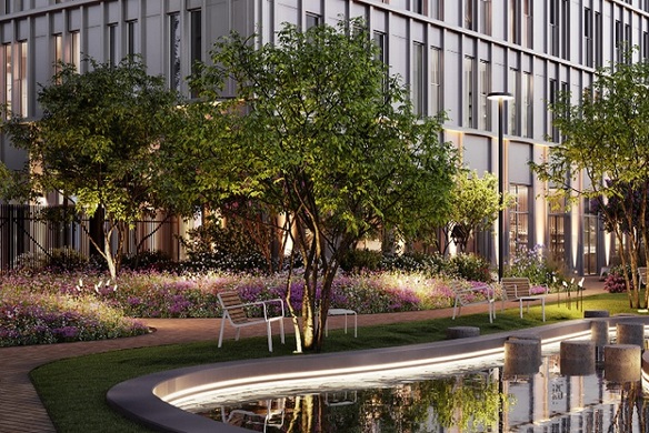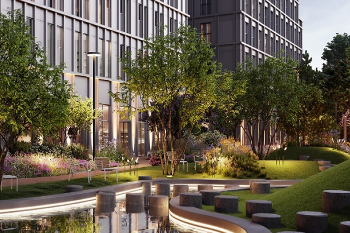 В проекте реализована концепция «двор без машин», что сделает территорию безопасной и создаст ощущение приватности. Во дворах прокладываются пешие бульвары и велодорожки, высаживаются декоративные кустарники и высокие деревья.