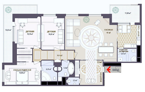 На типовом этаже расположены: две 3-х комнатные квартиры площадью 137,5 кв.м. и две 4-х комнатные (площадь каждой – 168,9 кв.м.). Все квартиры имеют окна на две стороны света. Удачная планировка позволяет легко разделить квартиру на приватную и общественную зону, а имеющиеся коммуникационные стояки разместить ванные комнаты и подсобные помещения в любой части квартиры.