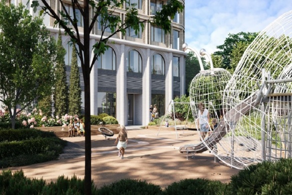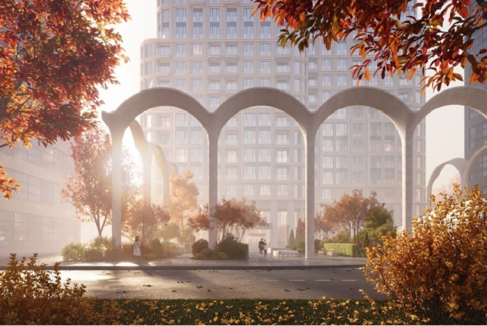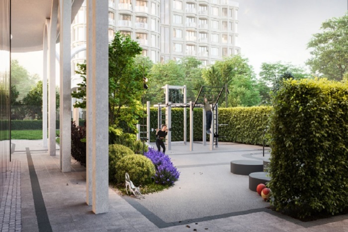 Просторный внутренний двор оформлен как приватный сад с каскадными фонтанами, арт-объектами, скульптурами, патио с перголами, боскетами и зелеными комнатами. Для проведения праздников продумана событийная площадь, а отдохнуть вечером можно будет в лаунж-зонах с подсветкой или на скамье у аллеи. Для детей оборудуют игровые площадки, для занятий спортом – турники и тренажеры.