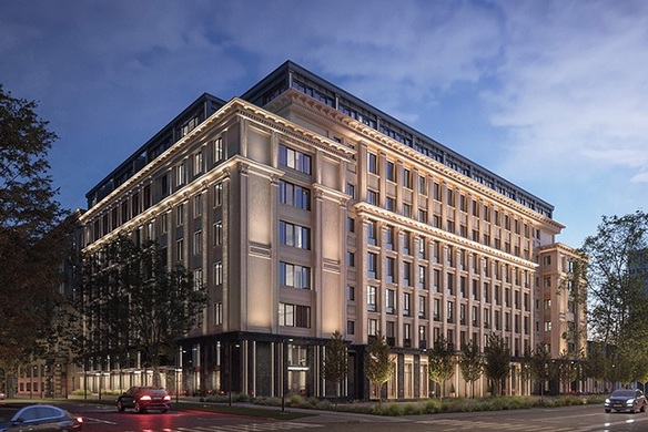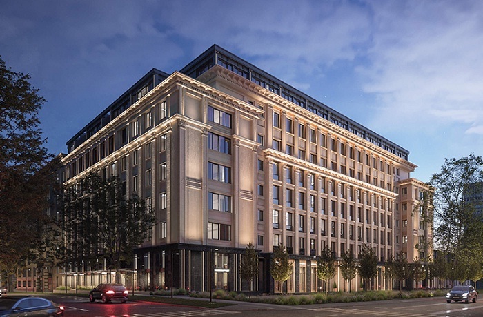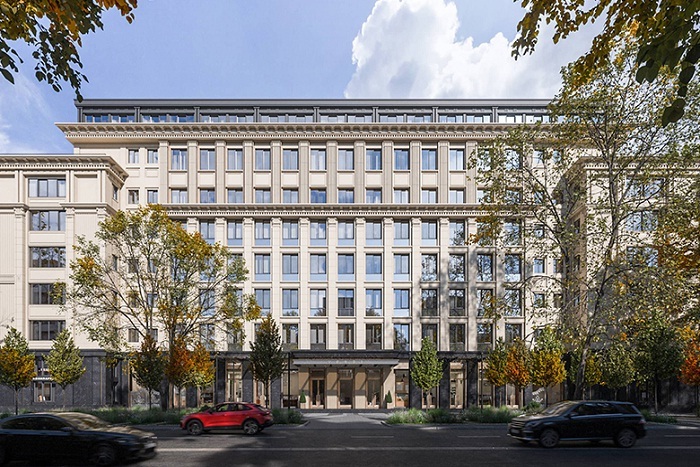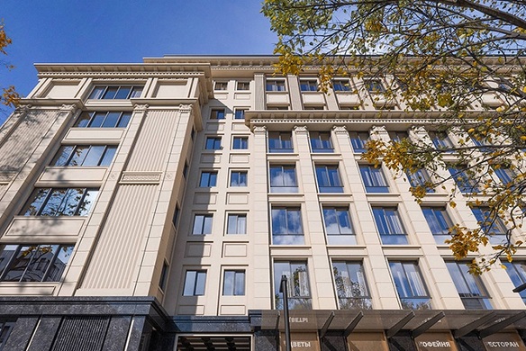 Восьмиэтажное здание общей площадью 9800 кв. метров выдержано к неоклассическом стиле, привлекая внимание панорамными окнами, фасадами с отделкой из природного камня, дизайнерскими входными группами.
