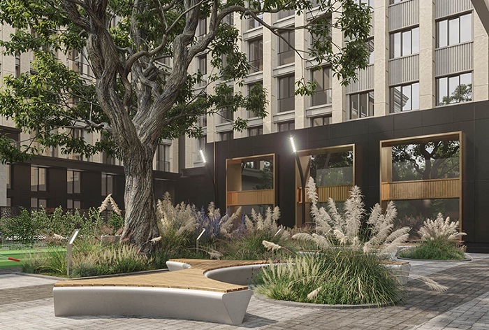 Первый этаж отведен под коммерческие помещения — там откроется салон красоты, ресторан, флористическая студия. В подземном уровне разместится паркинг. Закрытый внутренний двор-патио станет зоной отдыха.