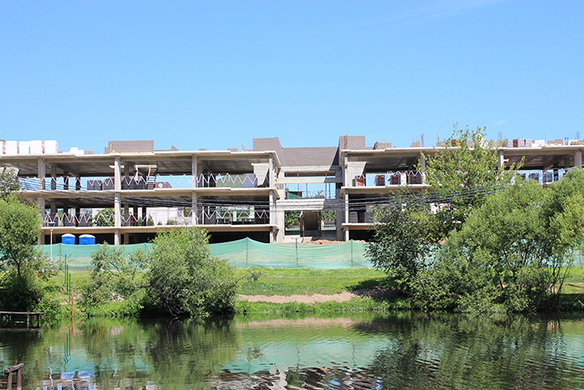 Он строится в Троицком административном округе на берегу Десны неподалеку от границы с зеленой зоной — окна фасада выходят прямо на речную набережную с оборудованным пляжем.