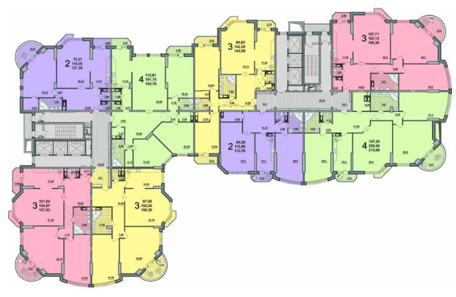 Главные архитектурные детали – эркеры, панорамное остекление. Подъезды оснащены скоростными лифтами OTIS, опускающимися до уровня подземного паркинга. Жилой фонд включает в себя квартиры площадью 90-315 кв.м. Планировка – свободная с разграничением спальной и гостевой зон. Застройщиком предоставляется возможность блокирования апартаментов в любом направлении.