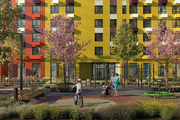 Обширная территория застраивается монолитными разновысотными многосекционными корпусами — фасадные решения для каждого индивидуальны. Входные группы с высокими потолками, подъездами на уровне земли и дизайнерским оформлением станут одной из визитных карточек нового микрорайона.
