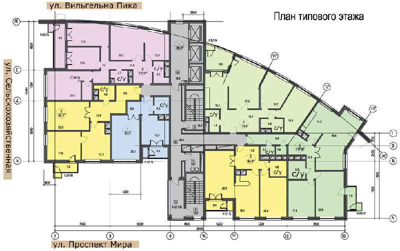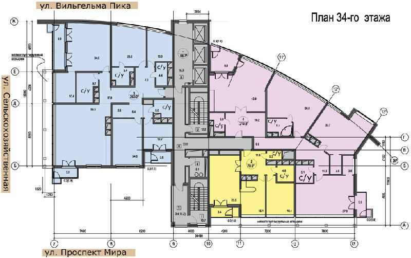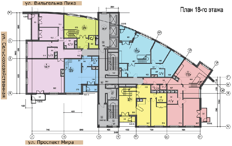 Планировка – свободная. Верхние этажи здания занимают квартиры с панорамным остеклением, из которых открываются виды на Останкинскую башню, выставочные залы ВВЦ. В помещениях монтируются двухкамерные стеклопакеты, радиаторы с терморегуляторами. Многокомнатные апартаменты оснащаются двумя санузлами. Лоджии и балконы остеклены.