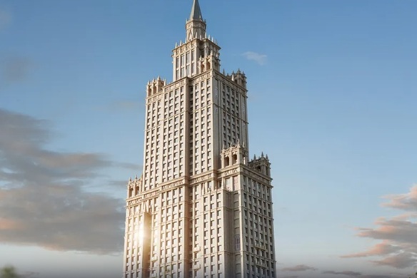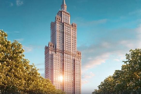 Новый комплекс – это башня с переменной высотой. Визуально здание делится на 4 ступенчатых блока, постепенно утончая объем, словно пирамида. Архитектура небоскреба выполнена в стиле «московский ренессанс» и сочетает черты античности, барокко и ар-деко. Фасады украшают колонны, арочные окна, пилястры, скульптуры и орнамент. Узнаваемый элемент столичной архитектуры – пирамидальный шпиль, покрытый сталью, расположенный на крыше высотной башни.