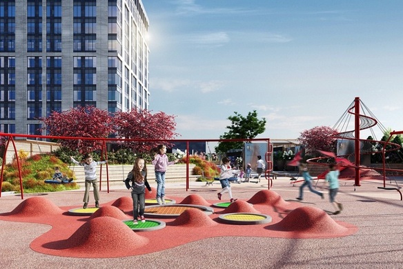 На эксплуатируемой крыше стилобата оборудована зона отдыха, подземный уровень занят паркингом. В закрытом внутреннем дворе проведено озеленение, установлены спортивные и детские площадки.