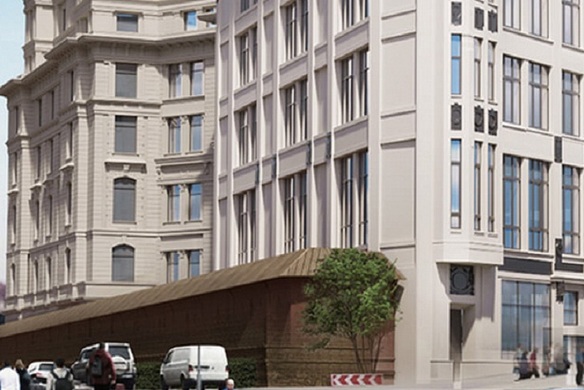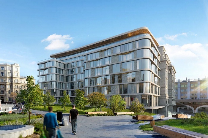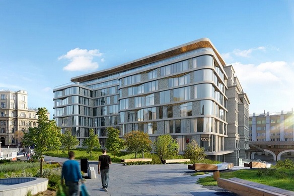 Проект интересен тем, что в нем удачно сочетается современные архитектурные решения и тщательно отреставрированные исторические элементы большого восьмиэтажного здания, занимающего целый квартал.