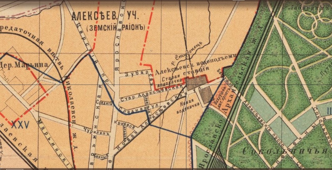 На карте начала 20 в. хорошо виден водопровод и обозначения насосной станции