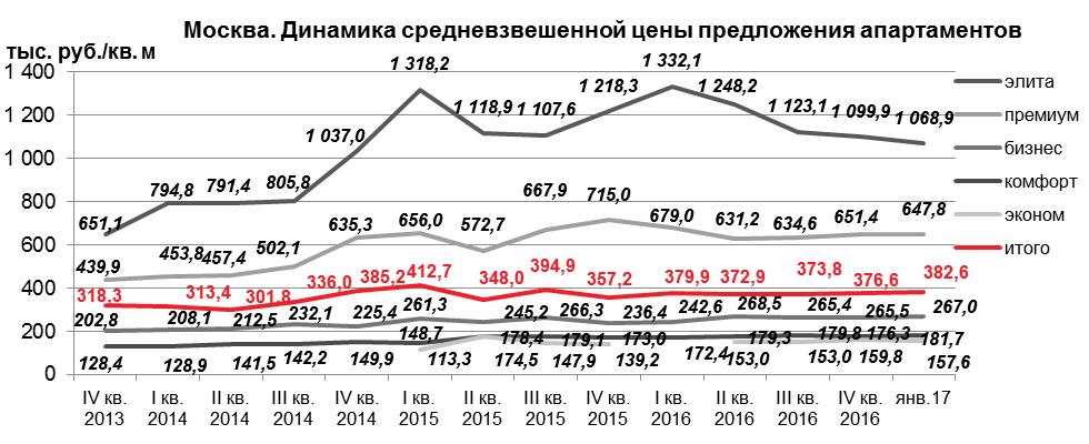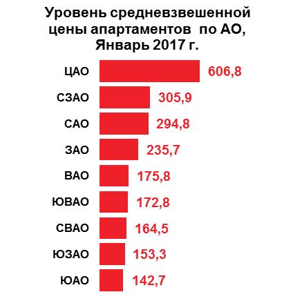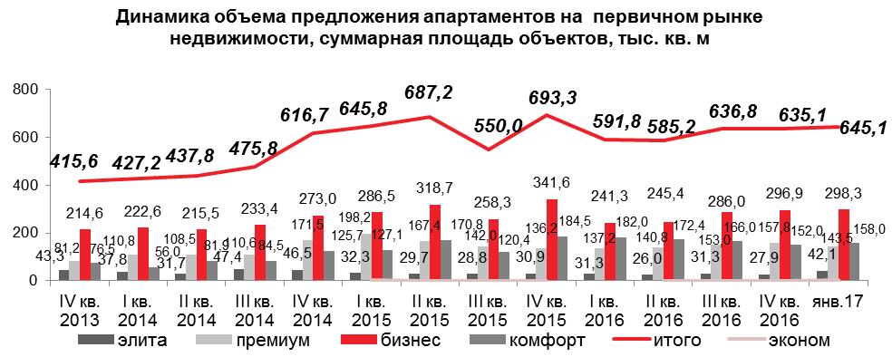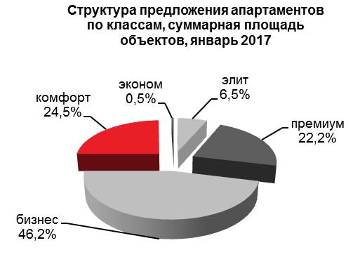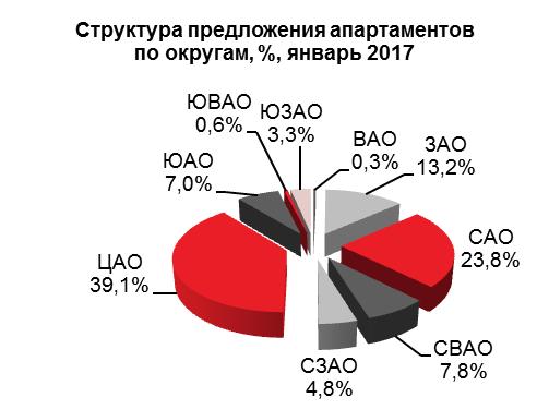 В январе 2017 года доля апартаментов от общего объема предложения рынке новостроек Москвы составила 20,9%, в продажу поступило около 10 тыс. кв. м нового предложения апартаментов за счет возобновления продаж в элитном апарт-комплексе «Фабрика Марата».
