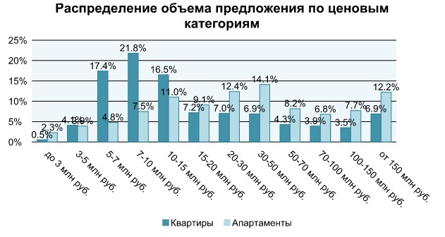 Если рассматривать структуру предложения квартир и апартаментов в разрезе ценовых сегментов по всей Москве в целом, то в глаза сразу же бросается перекос: почти 44% квартир сегодня продается в ценовой категории до 10 млн рублей, в то время как апартаментов в данном сегменте представлено менее 20%. А на рынке высокобюджетной недвижимости ситуация отмечается ровно противоположная: по цене от 50 млн рублей в столице продается 18,6% квартир и 34,9% апартаментов.