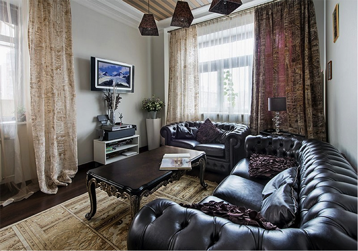 В гостиной преобладают серо-бежевые тона. Мебель преимущественно темная, а вот стены и текстиль белые, либо светло бежевого оттенка. Так как окна выходят на обе стороны дома, в квартире всегда светло и солнечно, чтобы по максимуму использовать естественный свет хозяева не стали на окна вешать темные портьеры, а заменили их легкими и светлыми шторами.