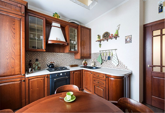 Кухня оформлена в белых тонах, а вот сам кухонный гарнитур и мебель изготовлены в классическом цвете дерева. Кухонный фартук выложен светлой мозаикой, а столешница выполнена из белоснежного гранита. В тон ей выполнена вытяжка над плитой. Пространство здесь небольшое, поместился только кухонный гарнитур и столик для завтрака, но очень комфортное и по-домашнему «теплое».