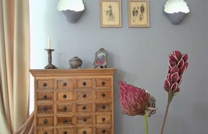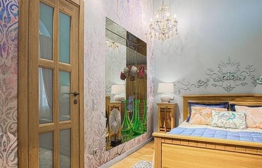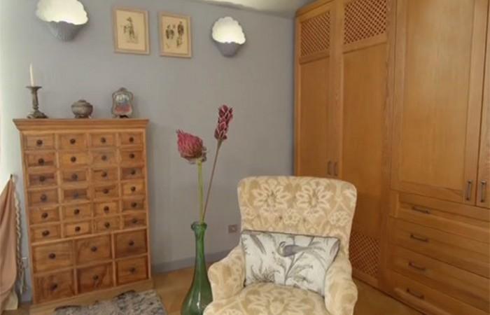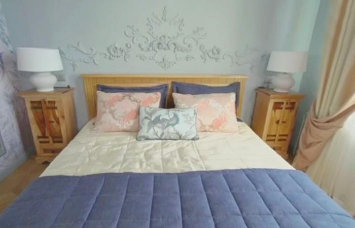 Дизайнеры проекта решили оформить помещение в полуколониальном стиле, с использованием большого количества мебели из светлого дерева. Для этого были отреставрированы комод и два винных шкафчика из хозяйской коллекции, они заняли место прикроватных тумбочек. Саму кровать заказали в мастерской, расположенной в Москве.