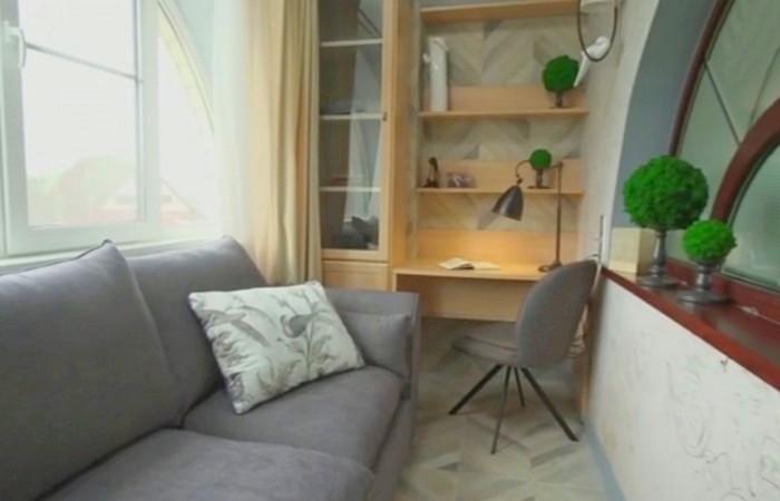 Входную дверь сделали в специальной складывающейся системе для небольших пространств. Рядом расположенную дверь на лоджию заказали с полностью зеркальной поверхностью. В лоджии одну из сторон заложили кирпичами и утеплили. Здесь же поставили рабочее место в стиле 60-х годов и стул с диваном, обитые твидовой тканью. Получился очень компактный, но теплый и удобный кабинет. Семья Галибиных осталась полностью довольна результатом.