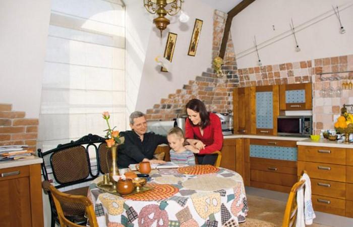 Рядом довольно удобно расположена просторная кухня со светло-коричневым кухонным гарнитуром. Напротив окна хозяева удачно установили обеденный стол круглой формы.