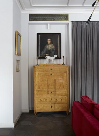 Практически весь антиквариат получен в качестве наследства, остальные предметы мебели и интерьера преимущественно приобретались в Италии. В квартире много картин и фресок. Для того чтобы разместить их все, построили дополнительную стену. Изначально, по проекту между кухней и столовой не предполагалось перегородки, но со временем добавили разделительные стенки, чтобы было где расположить картины.