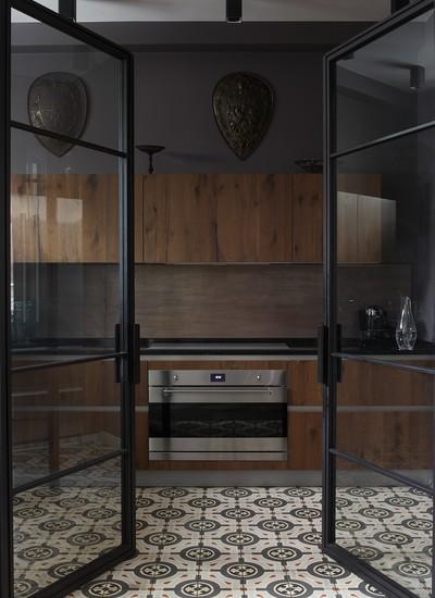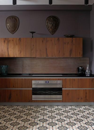 Кухня выполнена в минималистичном стиле, в теплых тонах. На полу выложена мозаика из цементной плитки, а фартук отделан металлом. Сам кухонный фасад сделан из дерева.