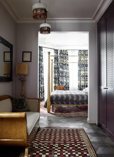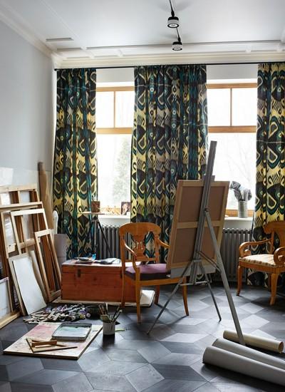 Стены во всех комнатах покрыты краской, в гостиной предполагался голубой оттенок, но со временем он стал сиреневым. Были выбраны сложные лавандовые, розовые, серые, голубые оттенки и графит. Идеальным завершением интерьера стали узбекские ткани с национальным орнаментом - из них сшиты шторы для всех комнат.