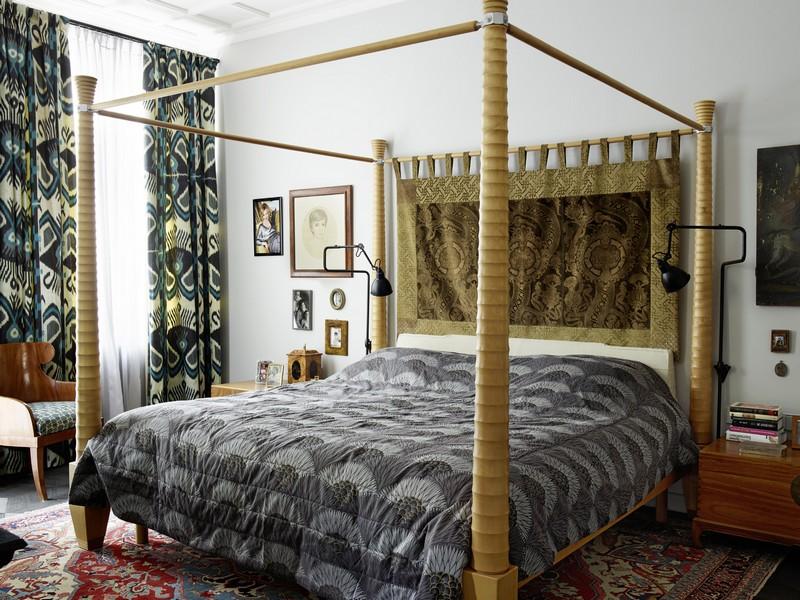 Центральное место в спальне занимает кровать. Она довольно массивная, но из-за резных колонн выглядит более изящной и гармонично вписывается в интерьер.
