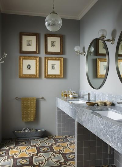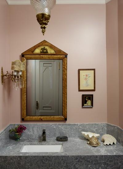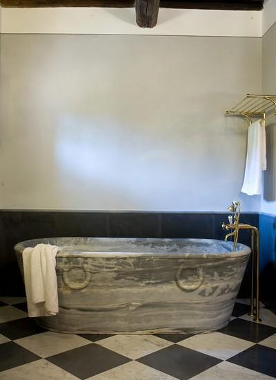 Пол в ванной выдожен старинным гранитом. Изначально предполагалась метлахская плитка, но ее не оказалось в наличии, и Вертинская полетела в Лукку, где и приобрела этот гранит. До этого он 120 лет лежал на полу в каком-то доме в Италии.