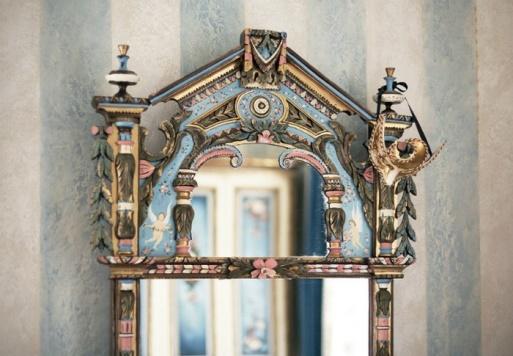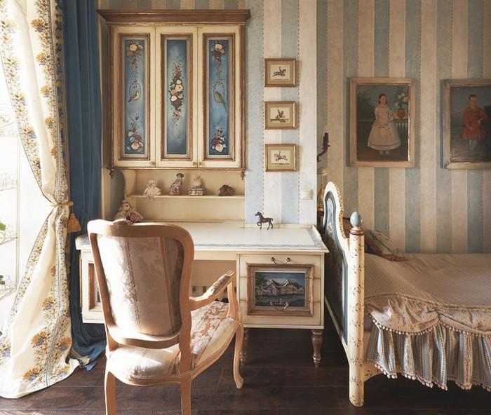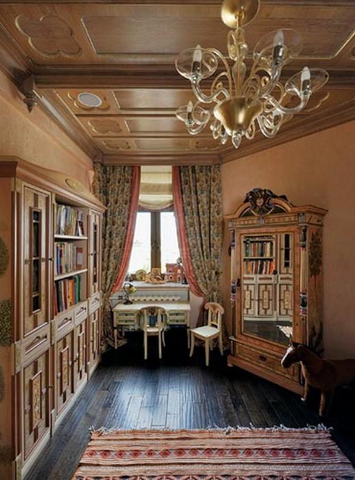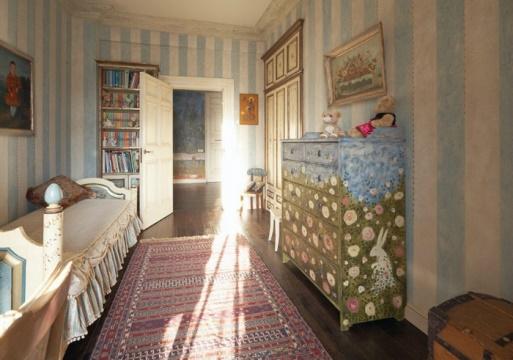 В комнате младшей дочери декорировано все под фактурный розовый платяной шкаф с гербами и зеркалом. Здесь установлена оригинальная имитация печки с красочными изразцами, а стены колерованы в розово-жемчужном цвете. Во всех спальнях установлены белые двери.