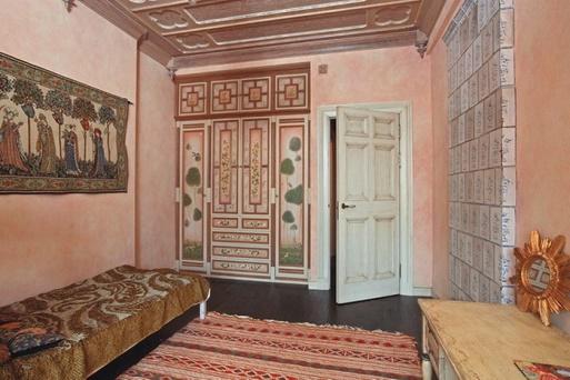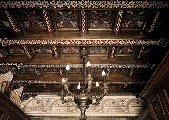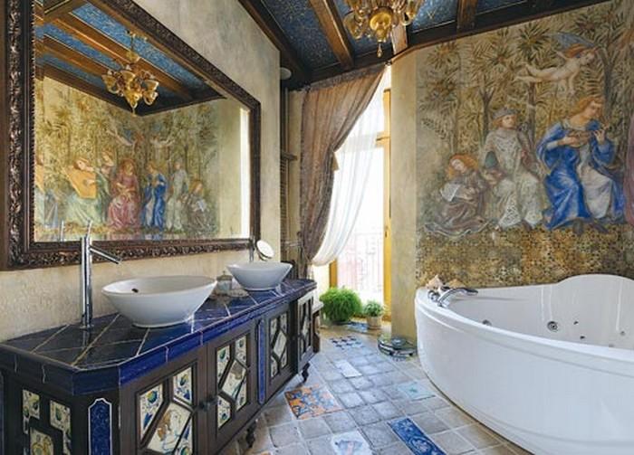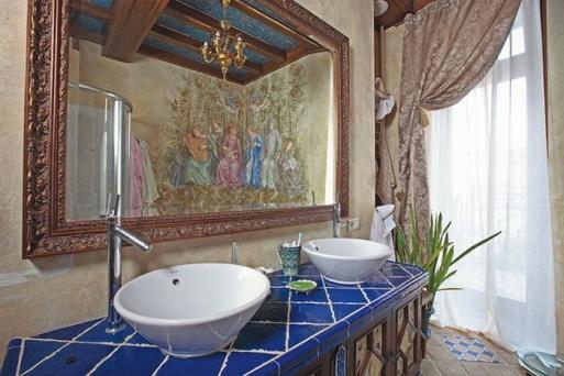 Есть здесь довольно оригинальное место не в плане оформления, а в самой планировке - это ванная с балконом. Фрески на стенах, как и в холле изображают райские сады, потолок оформлен синими балками, а на полу лежит расписная плитка, комбинированная с натуральным камнем. Умывальник изготовлен в семейной мастерской, там же отделан плиткой и вручную расписан. Здесь витает дух Флоренции и раннего Ренессанса.