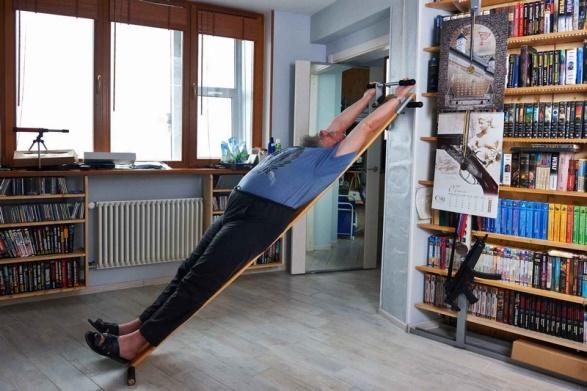 В просторной гостиной нашлось место и тренажёру, на котором эрудит в свободное от работы и чтения время тренирует мышцы и растягивает позвоночник.