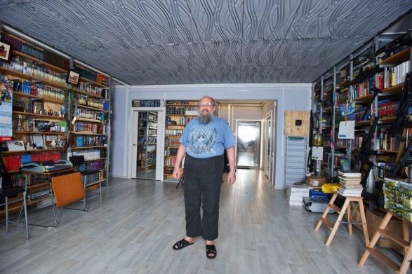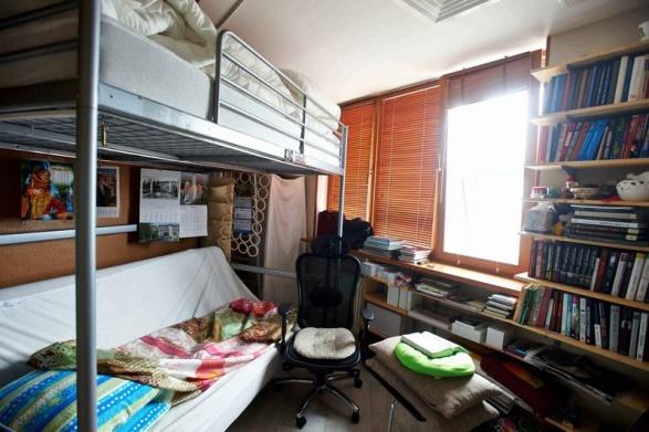 Отсюда можно пройти в гостевую, где есть двухъярусная кровать и уже привычные взгляду полки с книгами. Для обеспечения звукоизоляцией, помещение дополнительно оборудовано слоями пробкового листа.