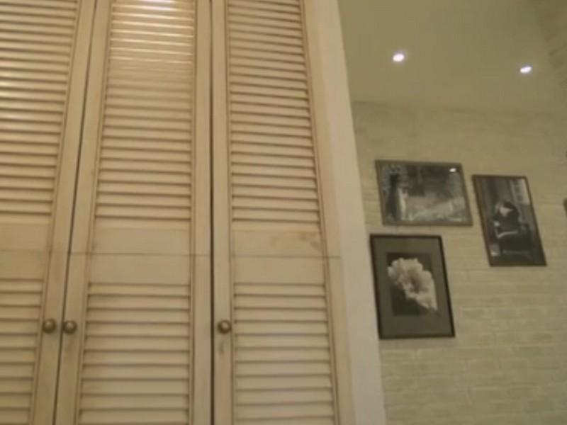 Одну из стен в холле декорировали белым кирпичом и картинами. Паркет и все поверхности в гостиной демонтировали. На одну из стен наклеили бумагу со старинными рукописями, а на место старого камина установили более современный на био топливе. Качественную кухню не стали демонтировать, а просто заменили фасады. Их и всю мебель искусственно состарили.