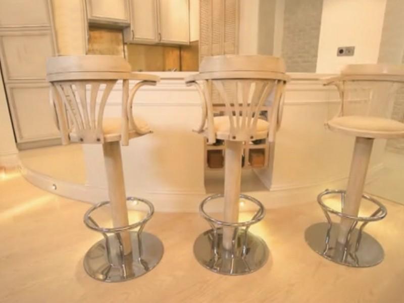 Гостиная соединена с коридором и кухней, которая расположена на небольшом пьедестале. Всего здесь 48 кв. метров. В старом ремонте было использовано много красного, синего и золотого. От этих цветов хозяин попросил избавиться. Интерьер пожелал сделать в стиле Прованс.
