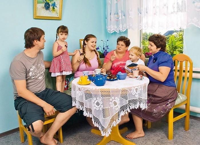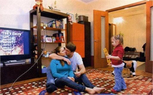 Обстановка довольно простая: на полу лежит ковер в разноцветный квадрат, на стенах ненавязчивые обои. Здесь же установлен большой плазменный телевизор и расставлено множество комнатных цветов. Хозяева пытались грамотно и по-максимуму занять все свободные места, которых в небольшом жилище оказалось не так много.