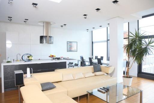 Решающими факторами при выборе именно этих апартаментов послужили огромные окна и расположение на двадцать девятом этаже. По словам хозяйки у нее создается ощущение, что квартира находится на вершине мира, откуда открывается великолепный вид на город. На окнах нет занавесок, а все стены выкрашены в светлые тона, паркет на полу имеет натуральный цвет дерева, все это помогает максимально задействовать естественный свет и зрительно еще больше увеличивает размеры помещения.