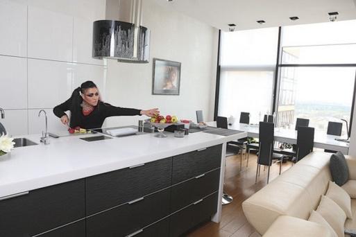 Кухня в черно-белом цвете выполнена в стиле минимализма с большим количеством зон для хранения, скрытых от посторонних глаз за специальными панелями. Певица не любит готовить и пользуется в основном микроволновкой и кофеваркой. На кухонной стойке всегда стоит ваза с фруктами.