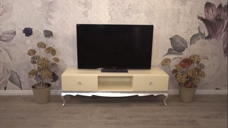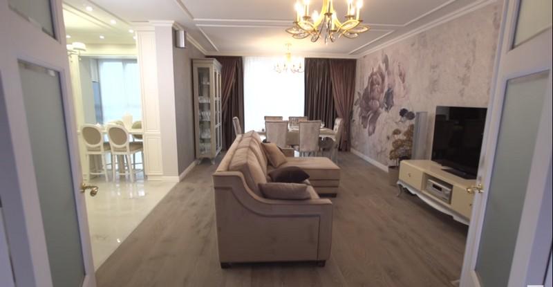 На одну из стен гостиной уложили фреску с пионами, ее хозяйка приобрела самостоятельно до начала ремонта. Мебель выполнена с золотыми элементами, а текстиль решено было использовать бархатный.