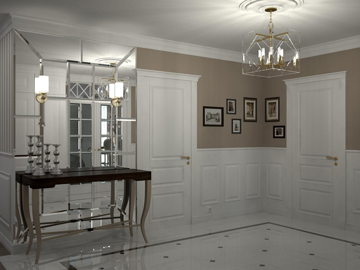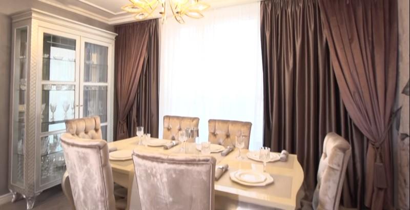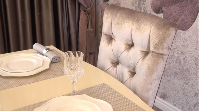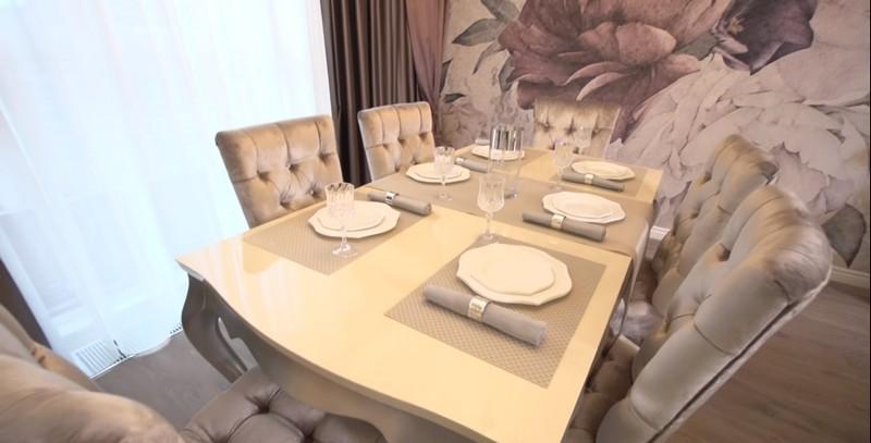 Гостиная разделена на две рабочие зоны: мягкую и обеденную. В обеденной установили большой стол, он был одним из пожеланий хозяина и витрина в стиле арт-деко отделанная сусальным серебром. В мягкой зоне установили большой диван и видеооборудование.