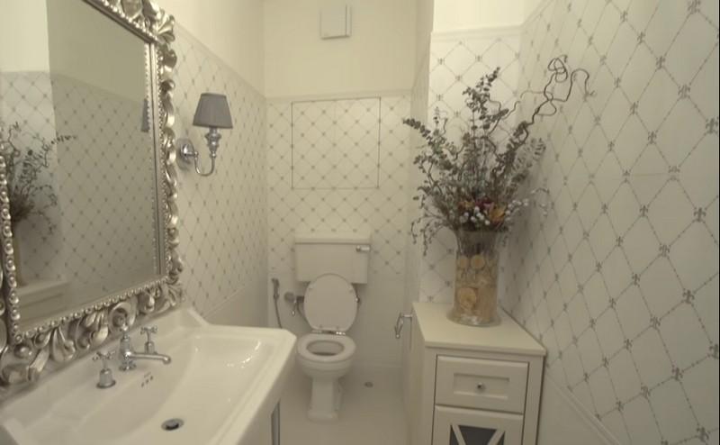 Санузел оформили в винтажном стиле эдвардианской эпохи. Плитка выложена в одном стиле с прихожей.