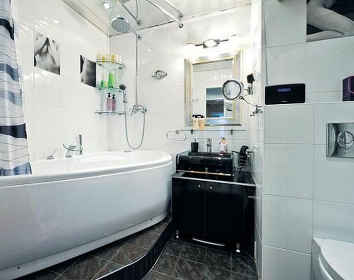 Санузел в квартире соединён, так было еще при предыдущих хозяевах. Джакузи расположена на небольшом пьедестале, зрительно отделена от остального пространства. Ванная выдержана в бело-черных тонах без лишних цветовых деталей, но в некоторых местах гармонично вмонтированы фотографии женского тела и коллаж мужского торса. Оригинальными решениями являются зеркальный потолок и теплый пол.