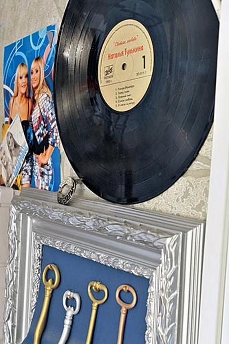 Во всем интерьере встречаются необычные вещицы. В коридоре - небольшая ключница с огромными ключами, ваза, часы и серебристый мешочек в тон затирке на полу и зеркальному обрамлению.