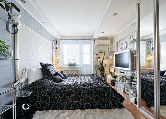 Спальня хозяйки выполнена в светлых цветах. Здесь много стекла, блеска и серебряных деталей. На стене за телевизором выложено вручную необычное панно из страз, такое же есть и у изголовья кровати. По углам вмонтированы стеклянные полочки, на которых расставлены всевозможные туфельки, привезенные с гастролей.