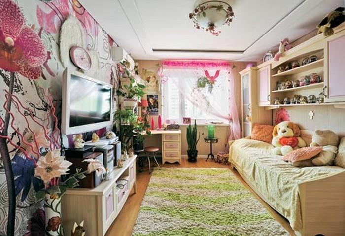 Такой стиль уже начинает утомлять подрастающую дочку, но пока удается обходиться сменой штор и покрывал. И розовая комната принцессы мастерски превращается в ярко зеленую или в нежно осеннюю. Немалое значение Наталия придает и освещению, по всему периметру потолка встроены точечные светильники, потолочная люстра украшена нежными розами. Есть дискотечный шар, но он присутствует в интерьере скорее для декора.