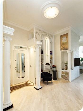 Квартира разделена на две зоны: приватную и общественную. Посередине расположен просторный холл с белыми колоннами (они остались от прежних хозяев). Здесь же встроено множество ниш для хранения подарков и сувениров.