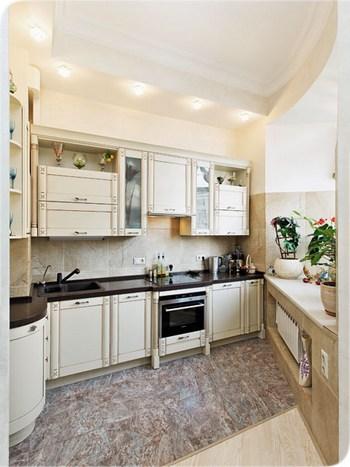 Кухня одно из любимых мест хозяйки, здесь она любит посидеть, отдохнуть и подумать. Гарнитур сделан под заказ на отечественном производстве. Фасад выполнен в молочном цвете, а шкафчики и полочки расположены так, чтобы хозяйке было максимально удобно готовить. Полы выложены светлой плиткой.