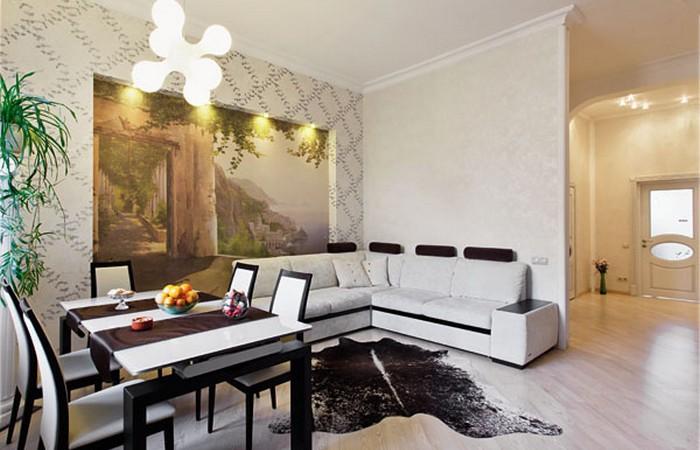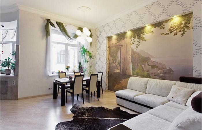 В гостиной пол выложен доской из ясеня, стоит большой угловой диван и стоит раздвижной стол прямоугольной формы. Для зрительного расширения пространства на одной из стен из гипсокартонна сделана имитация огромного окна с видом на залив.