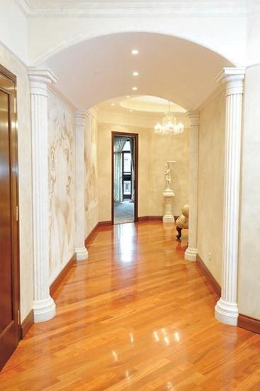 В светлых апартаментах пары предусмотрены: гостиная, хозяйская спальня, детская и «игровая», два санузла. Апартаменты имеют очень интересную круговую планировку. В квартире очень длинный коридор с белыми колоннами и рисунками в античном стиле, их рисовал знакомый художник. Из просторного коридора можно пройти в детскую комнату, кухню, а так же спальню и гостевой санузел.