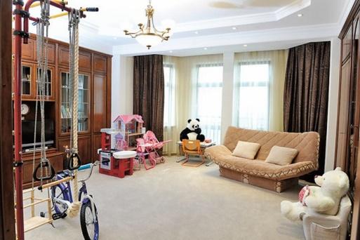 Рядом находится большая игровая комната со шведской стенкой, уютным диванчиком и другими играми и игрушками. Здесь же стоят две высоких стенки из темного дерева, они остались от родительского интерьера. Видимо ранее здесь был кабинет отца Юлии.